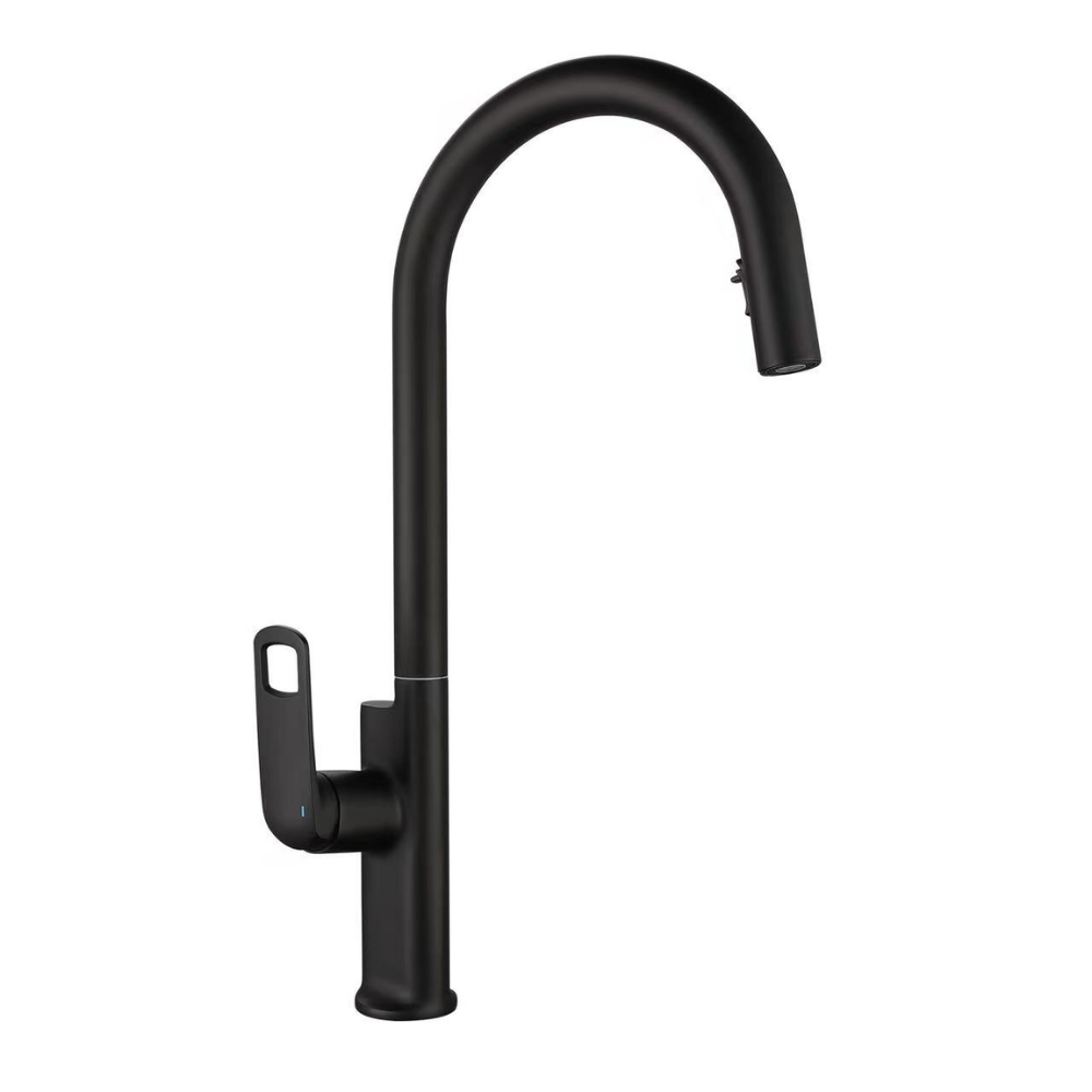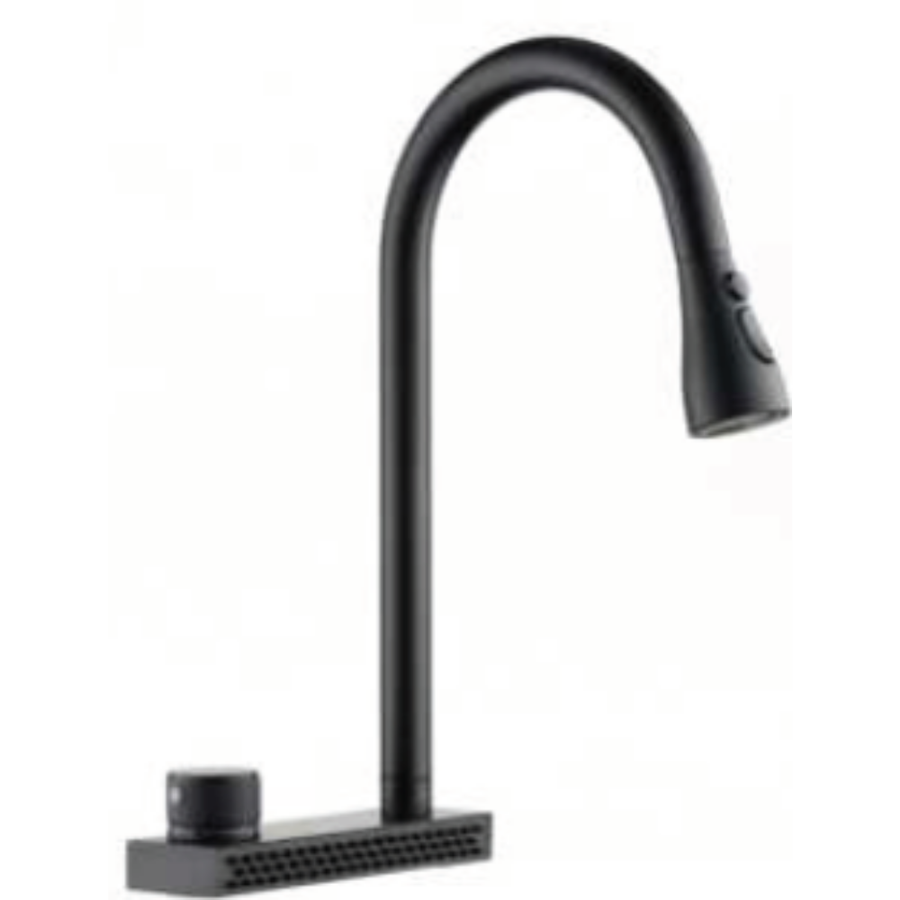 Porte Siyah Evye Bataryası – 3 Fonksiyonlu Çıkabilir Başlıklı Mutfak Musluğu (Tezgâh Üstü Su Şelalesi Akışı, Yüksek Açılı Tasarım)