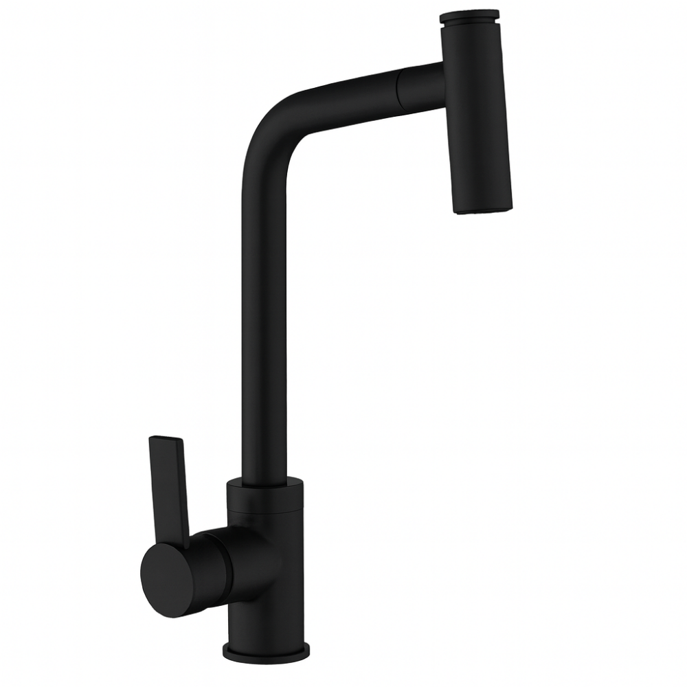 Solo Siyah Spiralli Evye Bataryası – Çıkabilir Başlıklı Yüksek Açılı Mutfak Musluğu (Mat Siyah Pirinç Gövde, Tek Kollu Kumanda)